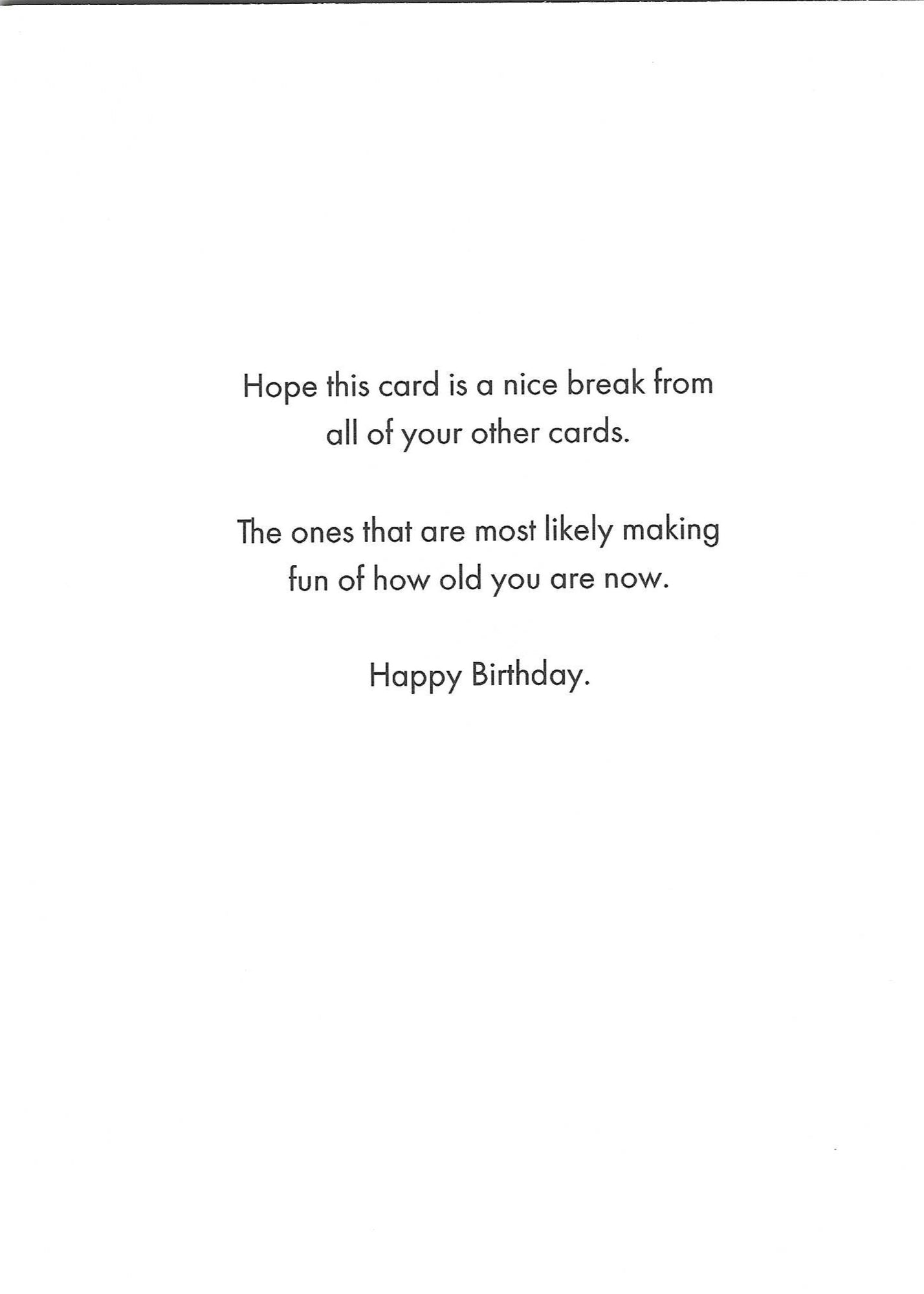 Inside of card reads, "Hope this card is a nice break from all of your other cards. The ones that are most likely making fun of how old you are now. Happy Birthday."