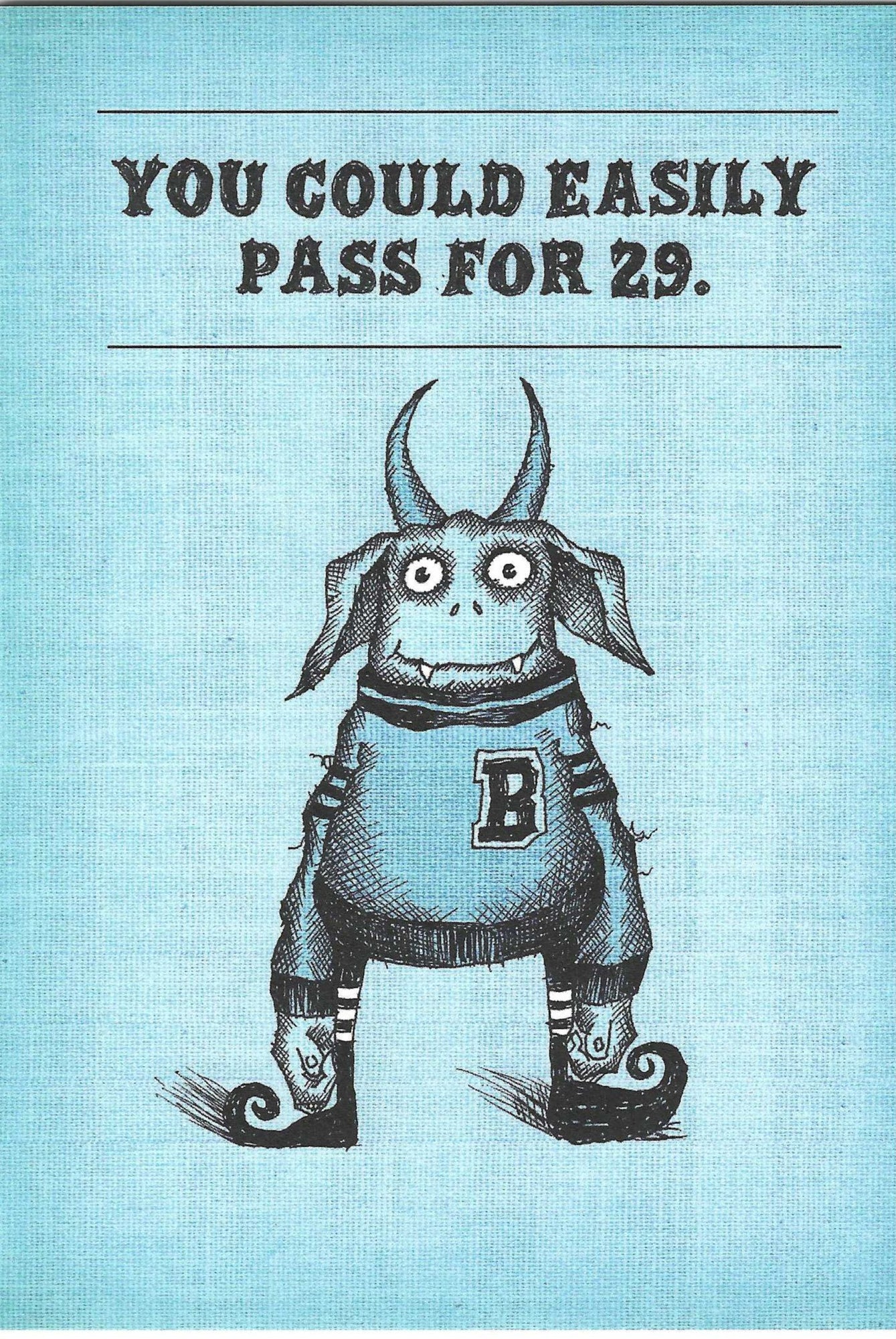 Cover reads "YOU COULD EASILY PASS FOR 29." in black ink on a textured faded blue background with a snaggle toothed, floppy eared, large horned creature wearing a college letter sweater and harlequin slippers.