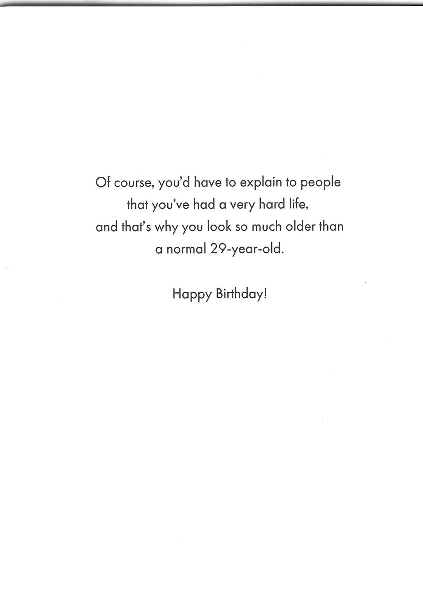 Inside of card reads, "Of course, you'd have to explain to people that you've had a very hard life, and that's why you look so much older than a normal 29-year-old. Happy Birthday!"